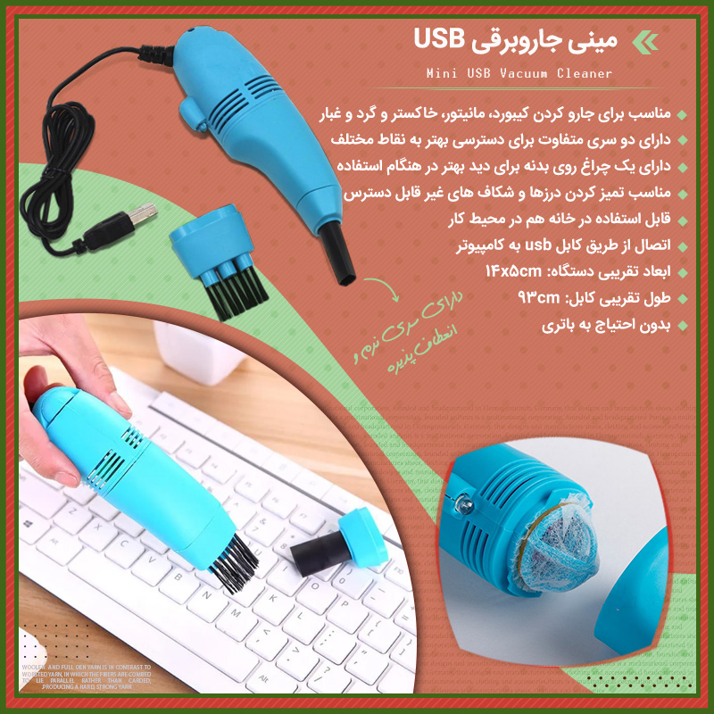 مینی جاروبرقی usb ، وسیله ای کوچک و قدرتمند جهت تمیز کردن سطوح رایانه ، کیبورد ،ماوس، اسپیکر و حتی تبلت، موبایل ، لپ تاپ و ... شماست. وسیله ای که به اذعان افرادی که از آن استفاده کرده اند کاملا مفید بوده و به راحتی سطوح مورد نظر آنها را تمیز و پاک مینماید.